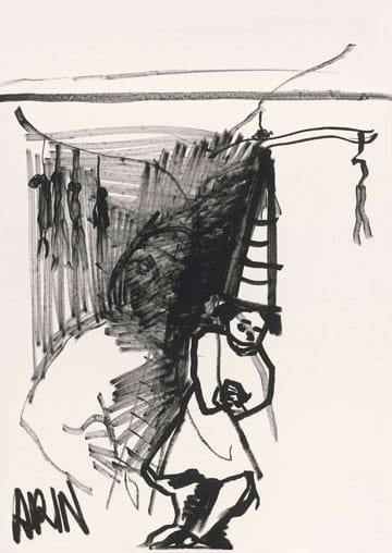 הקו הרישומי הוויטאלי והעז בעבודות השחור-לבן של איריס גולדברג המוצגות בבית האמנים, מיטיב לייצג את ההתמודדות עם האפל, היצרי והכאוטי. התערוכה “תנועות ריצה חיית חלום” עוסקת במעברים בין מחוזות זמן שונים ובודקת יחסים וגבולות. הגוף מוצג בה כמקום קמאי, מאגר בלתי נדלה של צפנים זיכרונות ומידע.