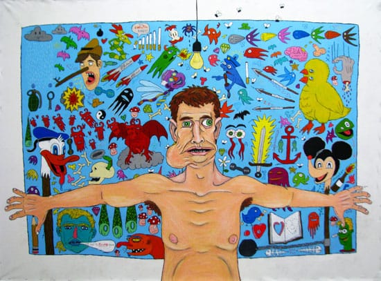 אדר אביעם, מגן אנושי, 2012, אקריליק, עיפרון וצבעי פנדה על בד